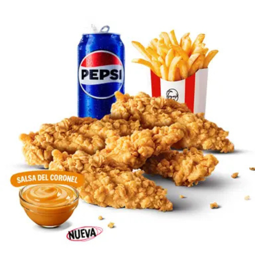 5 Chicken strips, papa frita regular, 1 salsa a eleccion, gaseosa en lata